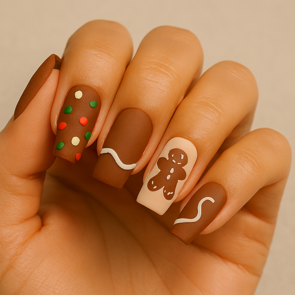 Gingerbread nails mimic the tones and textures of gingerbread cookies β warm browns, creamy whites, candy accents, and playful decals. Theyβre styled with matte finishes, glitter overlays, and micro art that evoke holiday joy.